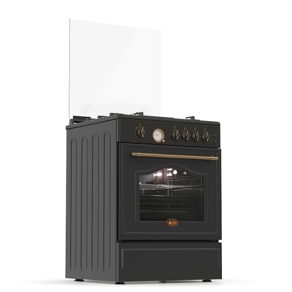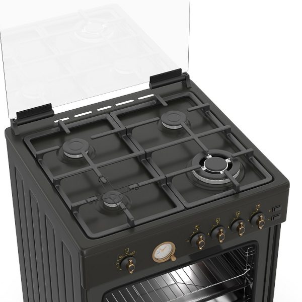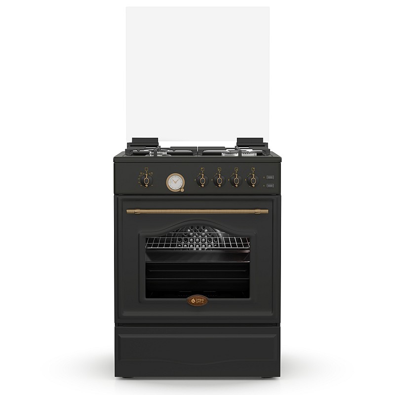 Θερμικά ασφαλείας, Γυάλινο καπάκι, Πόρτα με διπλό κρύσταλλο αποσπώμενο και μεταλλική διακόσμηση, Χειρολαβή μεταλλικό rustic, Αναλογικό χρονόμετρο, Σχάρες εστιών μαντεμένιες, Διασπορείς ματ εμαγιέ, Καυστήρες TECNA