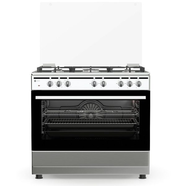 2 Ταψιά εμαγιέ βαθιά, 1 Σχάρα χρωμίου, Σούβλα με 4 δίχαλα, Μπεκ εναλλαγής αερίου (φυσικό αέριο – υγραέριο), Πόδια ρυθμιζόμενα καθ’ύψος
