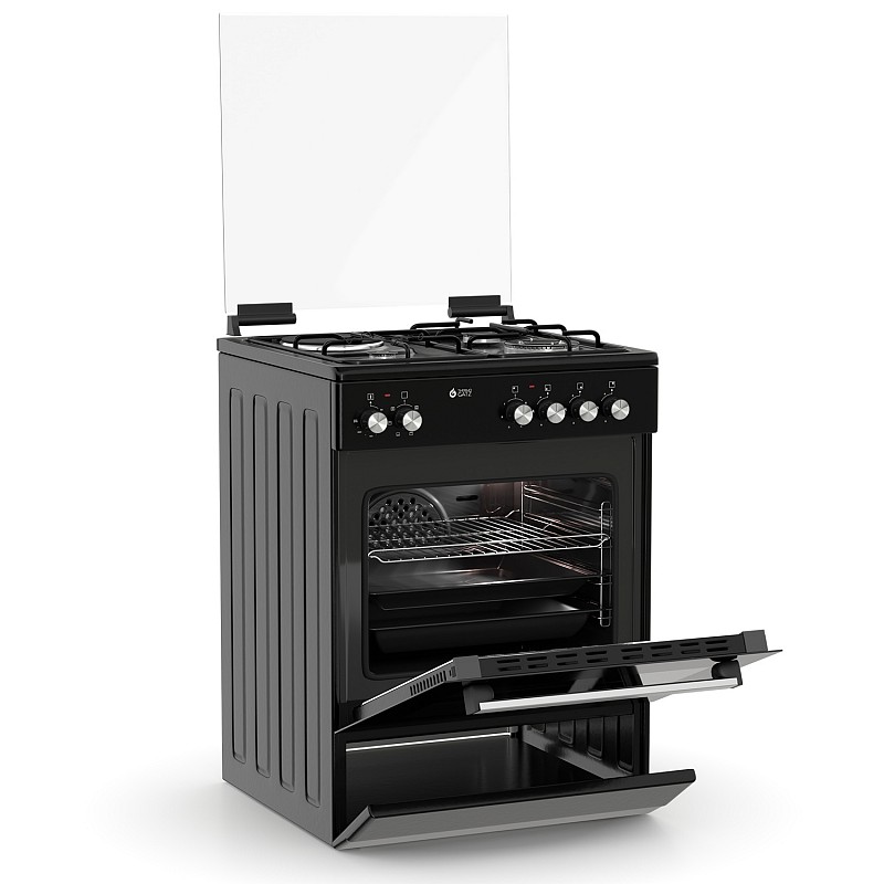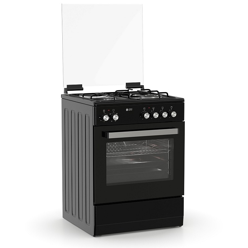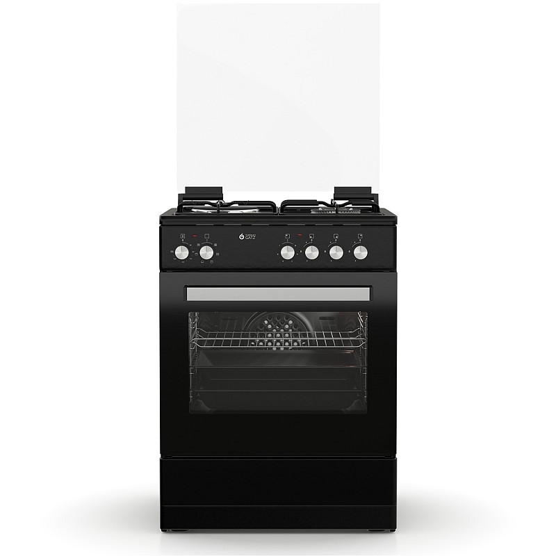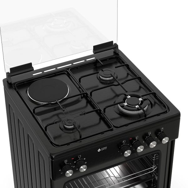 Θερμικά ασφαλείας, Γυάλινο καπάκι, Πόρτα με διπλό κρύσταλλο αποσπώμενο, Αποθηκευτικός χώρος με ανακλινόμενο πορτάκι, Σχάρες εστιών εμαγιέ, Χειρολαβή αλουμινίου, Διασπορείς εμαγιέ, Ανεμιστήρας στον φούρνο, Πλαϊνές σχάρες χρωμίου, Καυστήρες TECNA