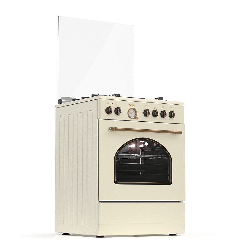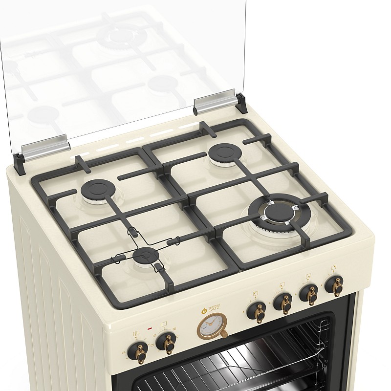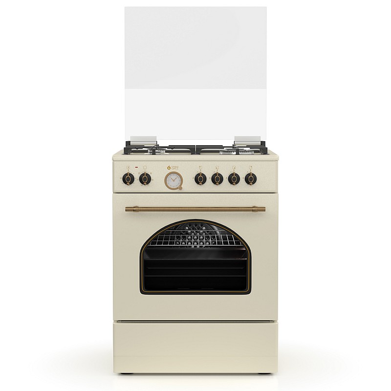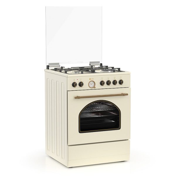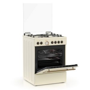 1 Ταψί εμαγιέ ρηχό. 1 Ταψί εμαγιέ βαθύ, 1 Σχάρα χρωμίου, Μπεκ εναλλαγής αερίου (φυσικό αέριο – υγραέριο), Πόδια ρυθμιζόμενα καθ’ύψος